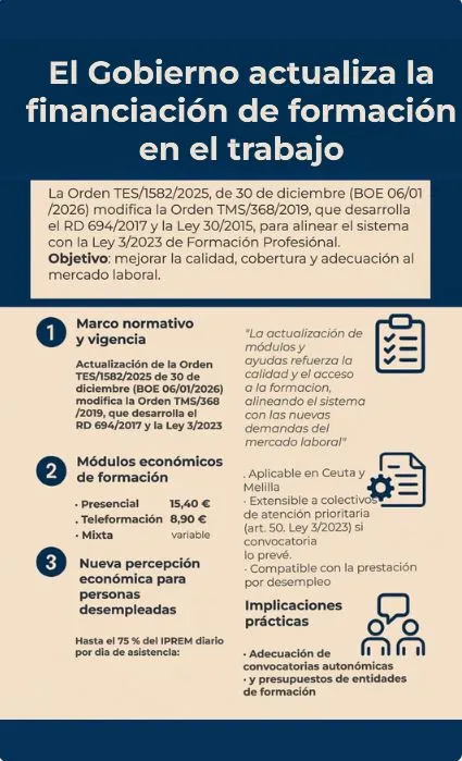 En el Boletín Oficial del Estado con fecha 6 de enero de 2026, se modifica la Orden TMS/368/2019 por una nueva Orden TES/1582/2025, que actualiza los costes máximo por horas del alumnado, incrementando su posible percepción económica hasta el 75% del IPREM diario para personas desempleadas de Ceuta y Melilla, así como para colectivos de atención prioritaria.